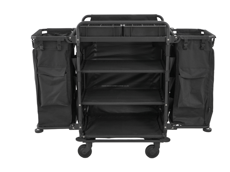 Streamline your hotel’s cleaning operations with this heavy duty maid trolley. Built with a sturdy black frame, 3-tier storage shelves, and large side laundry bags with front pockets, it offers maximum organization and capacity for housekeeping staff. Smooth-rolling wheels ensure easy maneuvering, while the durable construction guarantees long service life—perfect for hotels, resorts, and commercial cleaning services.